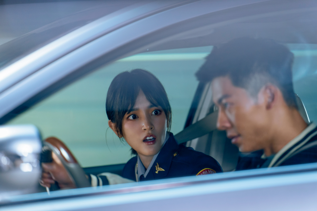 ▲ 王淨化身地表最正警花,跟許光漢在《關於我和鬼變成家人的那件事》飾演警局同事,兩人常在查案過程鬥嘴打鬧。(圖:金盞花大影業)