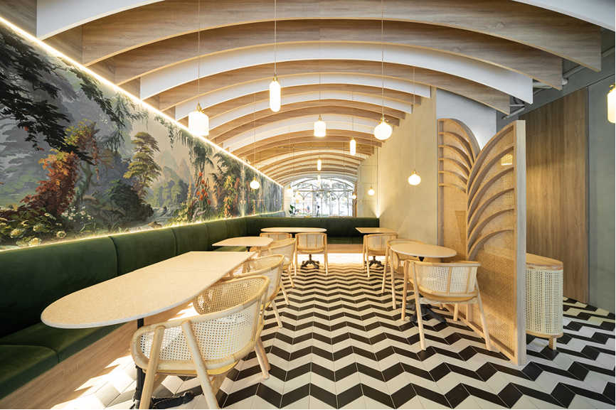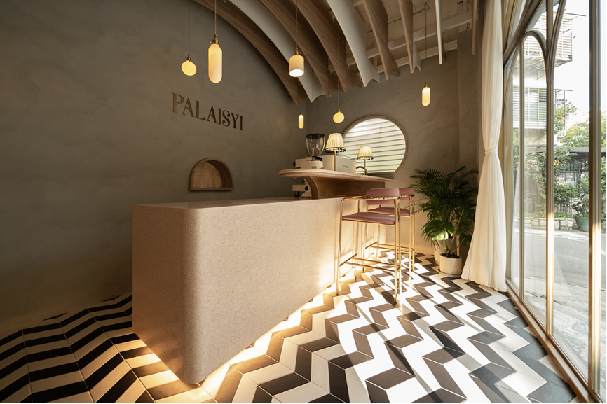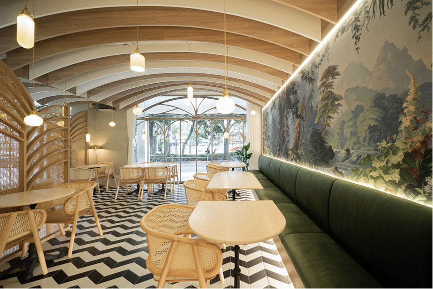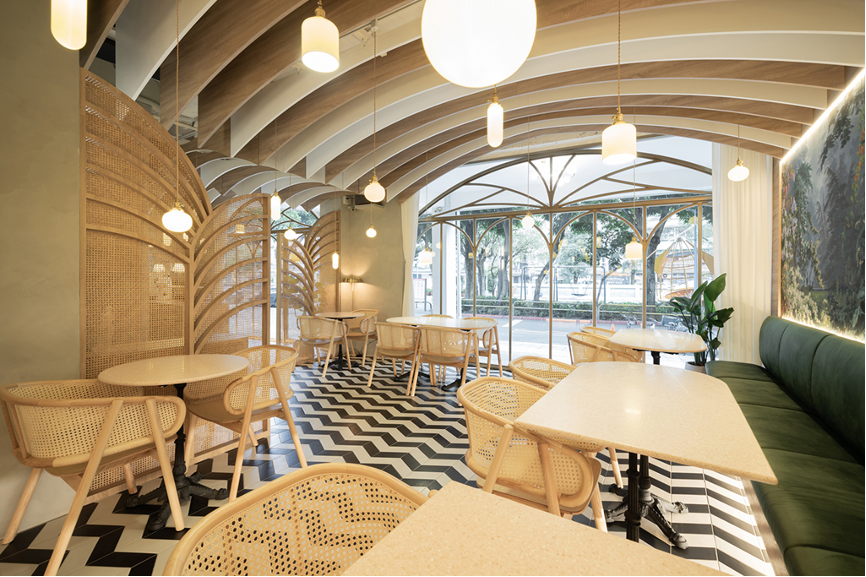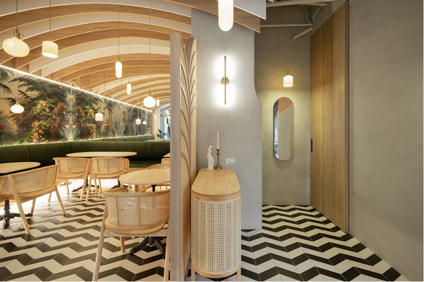 走進室內空間,藉由設計師的精心擘劃,在有限的空間中玩轉出無限的想像力。採用層疊漸變的手法架構出拱形天花板,並搭配地面鋪陳的黑白磁磚,共同塑造出視覺延伸感。運用錯位穿插的形式架設燈具結合拱頂,描繪出猶如陽光穿過樹梢、灑落而下的畫面,充滿了唯美浪漫的氛圍。在座位區的內側牆面裝設一面鏡子,透過其反射的特性,擴展整體空間視覺的深度。