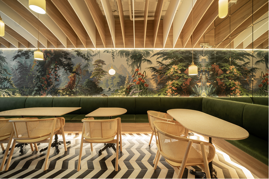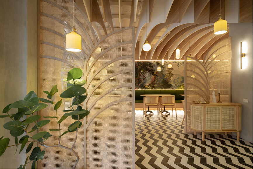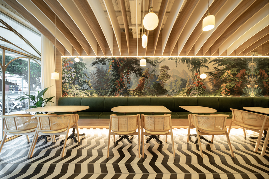 置身於內部空間,戶外的綠意與光景穿過落地窗引入室內,搭配自然元素的陳設,形塑出庭園的意象。採用木質調物件、藤編傢俱,搭配綠色布質沙發、粉色水磨石桌台作點綴,並添以叢林景觀的藝術壁紙,令用餐的賓客仿若身處於隱密地庭園中。其中幾何造型的餐桌,喻示能隨性地調整座位的組合,滿足不同賓客人數的座位需求。