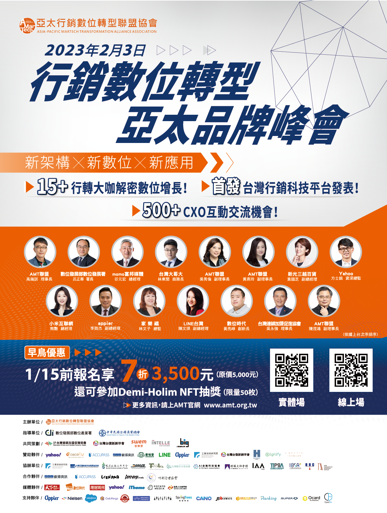 為加速亞太區企業品牌推動顧客數位體驗、解密數位增長、提升數位營收,亞太行銷數位轉型聯盟協會(AMT聯)將於2月3日在台北文創6F舉辦「第一屆行銷數位轉型 亞太品牌峰會」,現場邀請超過15家數位轉型標竿企業,聚焦在新架構、新數位、新應用三大主題分享與交流。