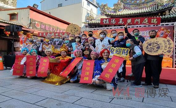 ▲嘉義火焰舞蹈團舞者兔女郎與財神爺獻舞,象徵紫氣東來福兔到。