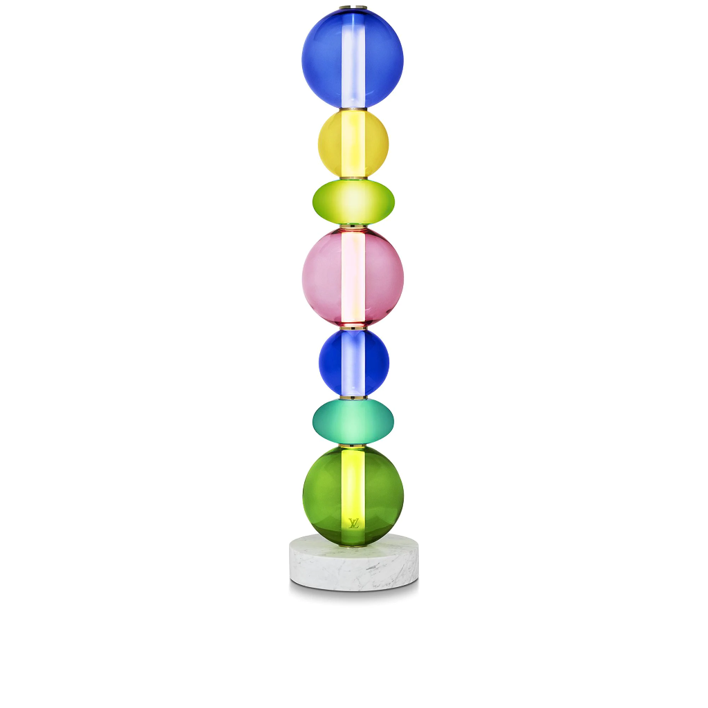 Objets Nomades 系列的Totem Lumineux燈座,集合七個手工吹製的威尼斯穆拉諾玻璃球,分別以孔雀藍色、卡布里黃色、加勒比綠色、威尼斯寶石紅色及翡翠綠色等五種顏色呈現,亦可於101旗艦店搶先預定。