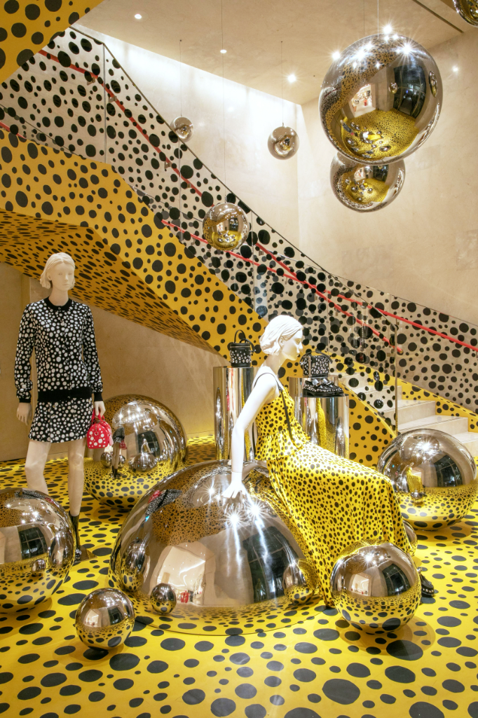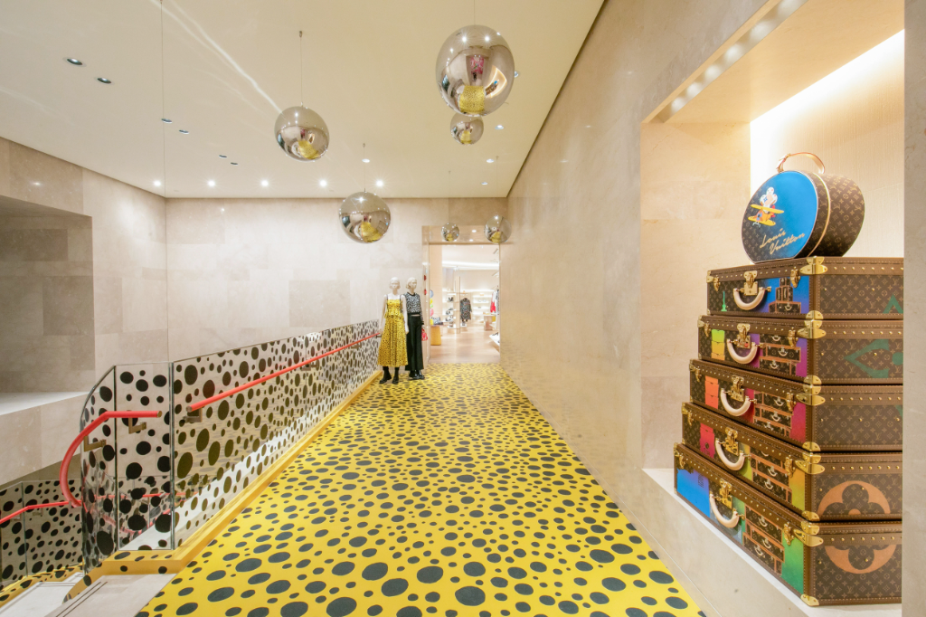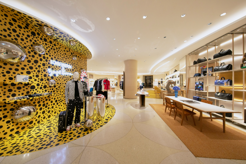 為慶祝此次台北101旗艦店盛大開幕,中庭挑高區與男裝區彩繪上期間限定黃色迷幻波點藝術裝置,隆重呈獻與日本藝術家Yayoi Kusama草間彌生聯名合作系列。首波上市系列包含彩繪圓點Painted Dots、鏡面圓球Metal Dots、無限圓點Infinity Dots與迷幻花朵Psychedelic Flower,渲染於女士與男士時裝、皮件、飾品配件和香水,將草間彌生的獨特筆觸圓點和路易威登的Monogram圖案碰撞出趣味十足的火花。
