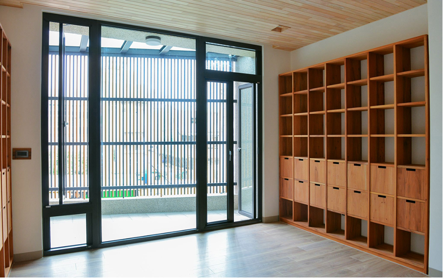 其次針對隔音與綠能上再進一步,開發真正的一體成形「雙層窗」,十五公分的外框配合五軌設計可支援雙層窗扇,中間空氣隔進一步阻擋隔音與冷熱有效節能降噪。並利用此外框延伸出無障礙落地窗,不鏽鋼軌道安裝地面上只有1.5公分高,不論是輪椅、腳踏車甚至機車、汽車都可以輕鬆通過,窗扇並可全收納單邊,使空間使用最大化。