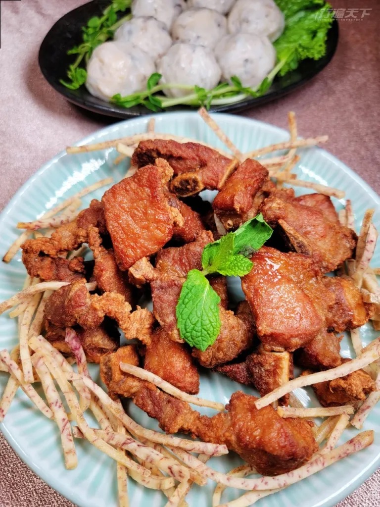 ▲ 大澳漁村香酥骨╱320元。豬腩排以鹽、糖、香港大澳漁村特產蝦醬醃至入味,再以二次炸熟,外酥內嫩,搭配酥炸芋頭絲,鹹香夠味!(圖:行遍天下)