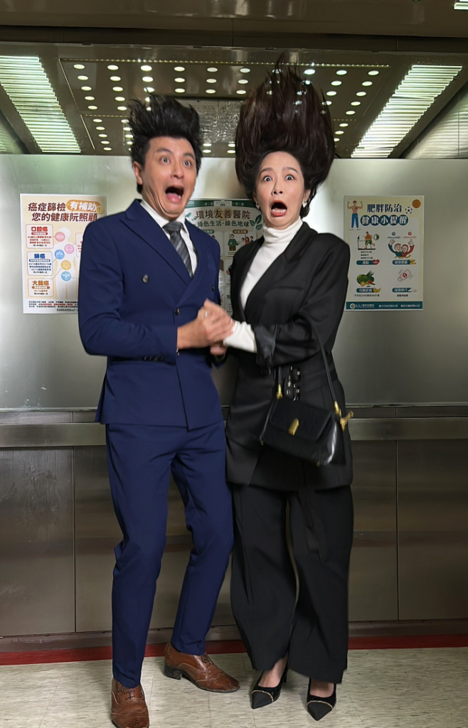 ▲ 唐豐(左)及茵芙把頭髮梳高,演繹電梯失速的樣子。 (圖:台視)
