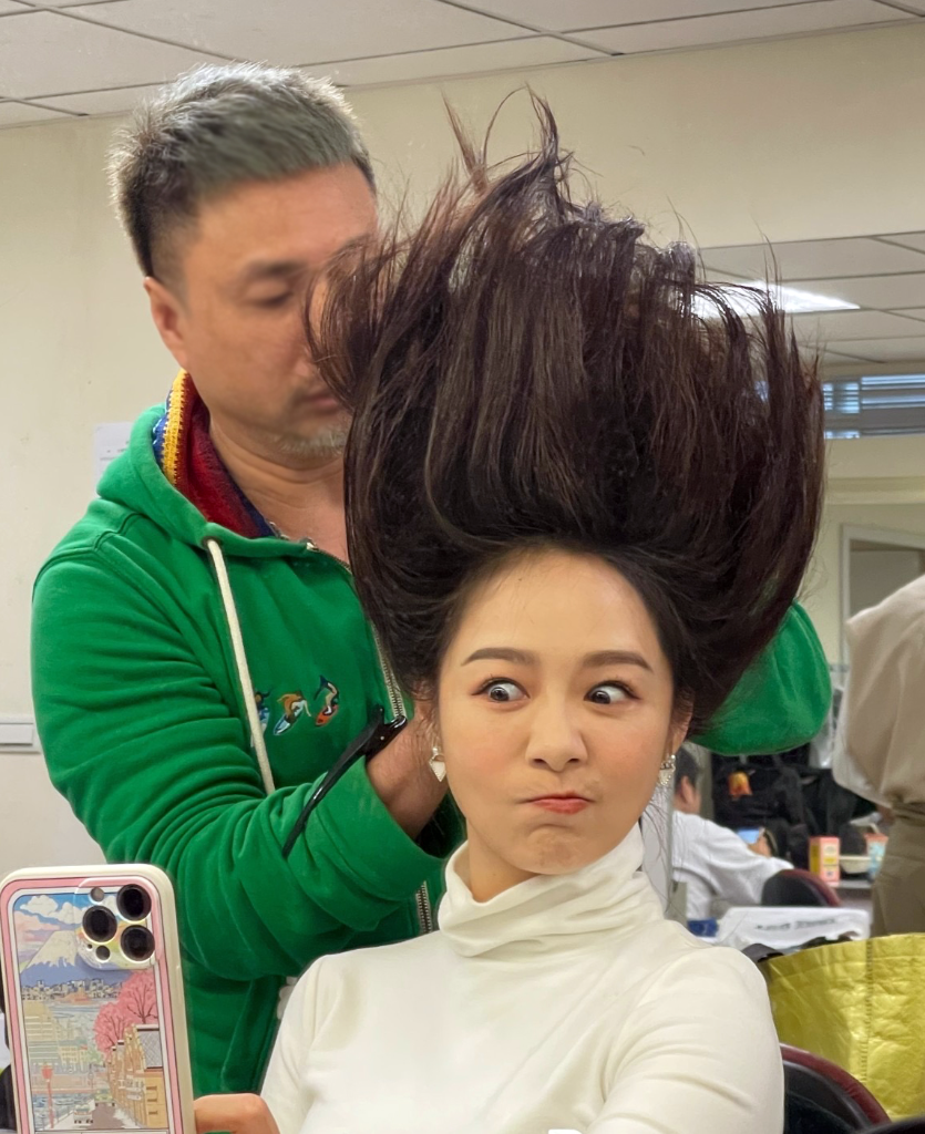 茵芙笑說:「我們立刻想到張學友的經典掃把頭,覺得超有趣、超有畫面!」唐豐也是第一次體驗這樣的造型,覺得很新奇,看到對手茵芙完成後的造型,也忍不住笑出來,因為茵芙梳完頭,整個人比他高上許多,開玩笑稱自己可能要穿高跟鞋了,還頻頻問茵芙:「走出去時會不會被門卡住?」由於當天還要拍林柏妤的婚禮戲,所有來參加婚禮的演員一看到茵芙的驚人造形,紛紛拿起手機合照,梳化間變的熱鬧,茵芙表示自己也很喜歡這個造型:「第一次這麼多演員和工作人員在拍戲期間主動想來合照,但還好後來是去給人家洗頭,不然我應該手會超痠會很崩潰」