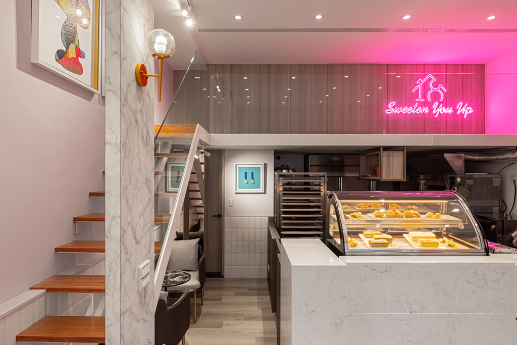 以自然視角設計櫃檯高度,微微傾斜的甜點展示櫃讓顧客可以輕易一覽、挑選甜品。窗前的座位區則讓人在欣賞風景之餘,可以細細品嚐甜點的滋味。樓梯下方的角落提供一隅隱私空間,以後方的鏡面延伸空間感。牆面上的兩幅畫,在相較明亮白淨的空間中,點綴一絲色彩。粉色霓虹燈透過玻璃與光線的反射下,層層交疊,創造不同角度的呼應,甜而不膩的氛圍色調,為壹拾捌甜點室打出最適切的品牌形象。