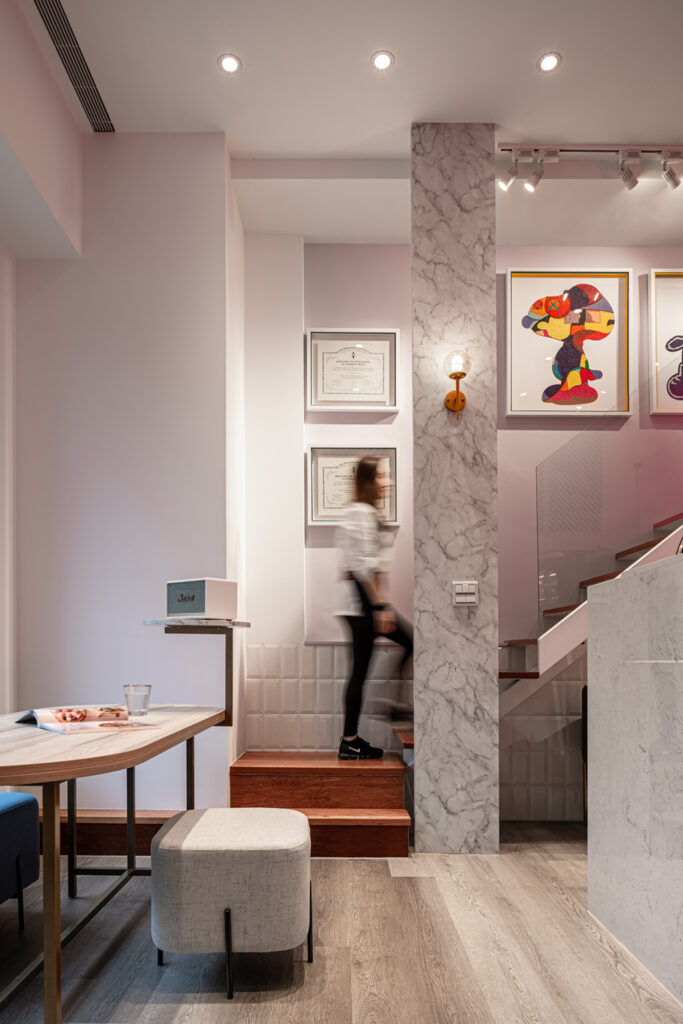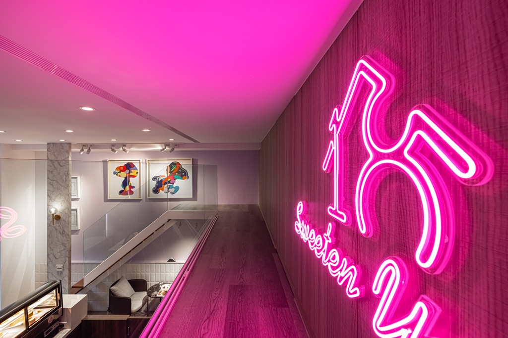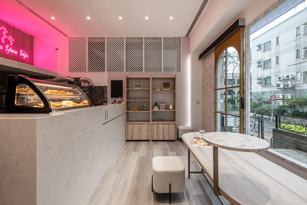 甜點帶給人們的感受不外乎便是夢幻與細膩,本案作為甜品店為了更加契合其品項風格的直觀印象,形拾室研曹登勝選擇運用色調與質地間的調和,在空間中塑造一如甜品般的氛圍。踏入店內可見北歐風四溢的木紋質地,首先營造出溫潤氛圍的同時,冷峻的淡灰白櫃檯與石紋柱體亦平衡了視覺的重量。一片片白磁磚和粉色漆、霓虹燈妝點著場域,有如甜品搭配般環環相扣,讓訪客在品嚐甜點的當下,也無不沈溺在甜而不膩的場域之間。視覺時刻牽動人們的情緒感官,本案以自身深刻印證了這點,出色的形象塑造除了成就品牌的發展,更勾勒了紐約設計大獎的銀獎讚揚。