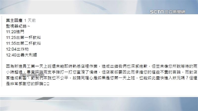 客人評論店剛開就進來了,等了2個小時只有飲料跟雞米花,旁邊晚來的客人都收到餐了,當場評論1星。老闆出來理論還把人趕出店,說工讀生第一天上班要有同理心,店家也在留言回覆監視器紀錄,11點20分進門,25分跟35分各送1杯飲料,12點04分出炸物,12點40分義大利麵,反駁客人等2個小時以上說法。