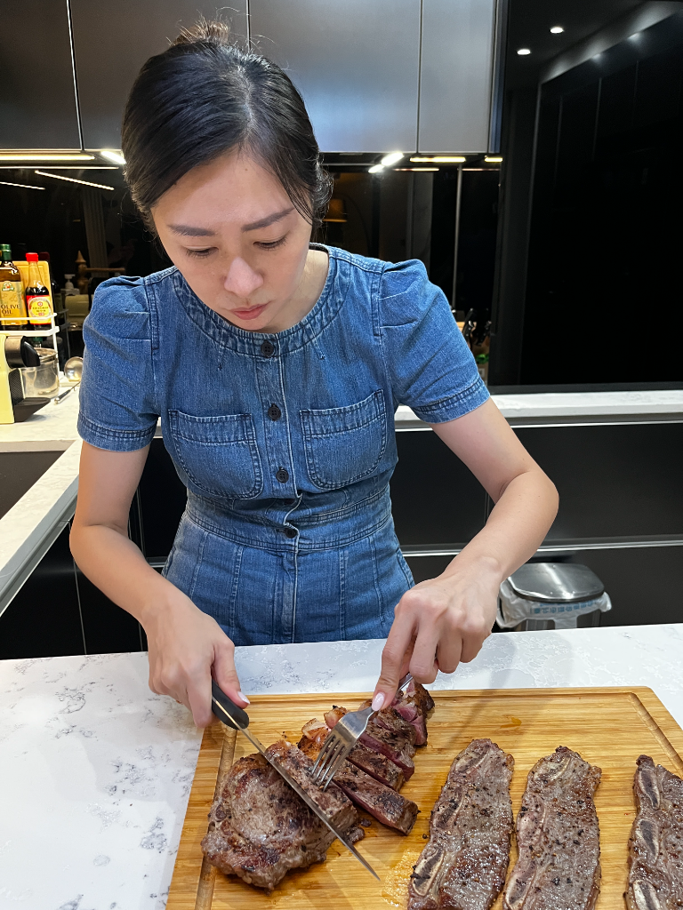 最後李明川請張棋惠推薦家裡一處最值得參觀的區域,她不假思索說:「廚房,因為廚房比較貴。」走近一看,才發現原來她的廚房檯面,是一塊很特別的帝雉石,防刮、防壓、防重、防染色,可以直接當砧板使用在上面切菜,對於喜歡下廚、目前同時斜槓經營「棋味賞」網站賣牛排的她來說,再適合也不過。