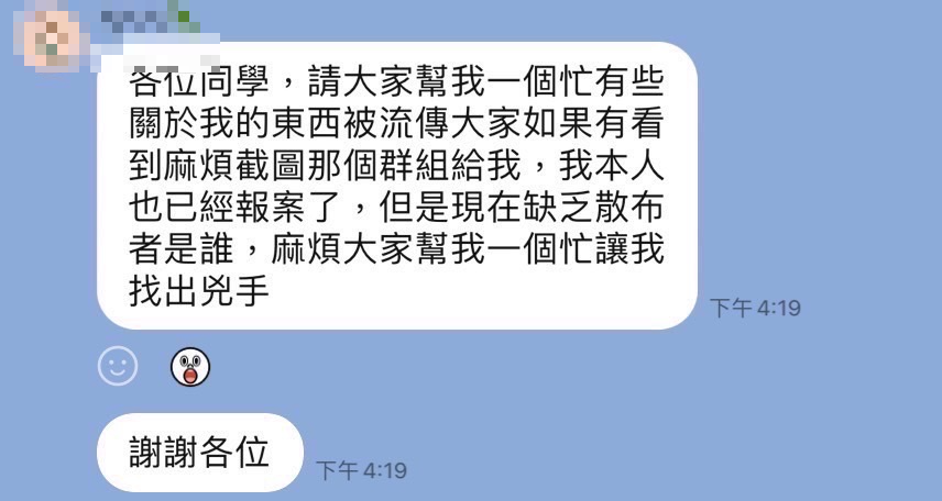 針對這起事件,影片中的女主角也在LINE群組發聲尋求大家的幫助,她說:「各位同學,請大家幫我一個忙,有些關於我的東西被流傳,大家如果有看到,麻煩截圖那個群組給我,我本人也已經報案了,但是現在缺乏散布者是誰,麻煩大家幫我一個忙,讓我找出兇手。」