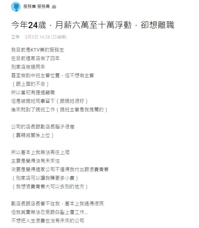 原PO在論壇Dcard提到,自己今年24歲,已經在KTV做服務生4年,甚至做到中班主管位置,每個月薪水6至10萬,但因為跟上面不合,因此不想做主管,之前曾提過離職,最後被挽留而改上晚班。