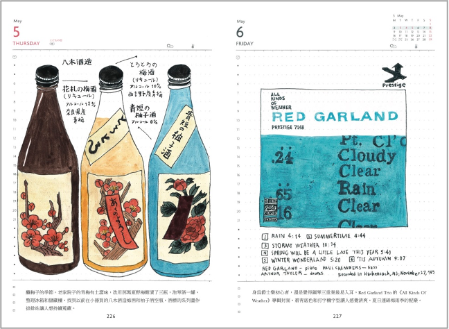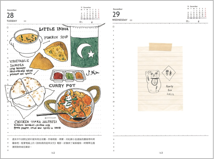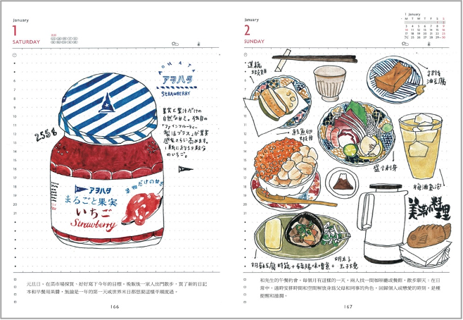 【連續好多年,我會在一月一日那天,到書店挑選當年要使用的「一日一頁」手帳,象徵新年新希望的儀式。一日一頁的格式自由,彷彿在書寫生活之書;日子有時豐滿,有時潔白。我想每人心中或多或少都有「365日」的幻想,期許自己每天重複一件小事,每天能多堅持一點點,每天都能感知到美的時刻,或寫字或插畫或料理,點滴積累成豐碩果實。】