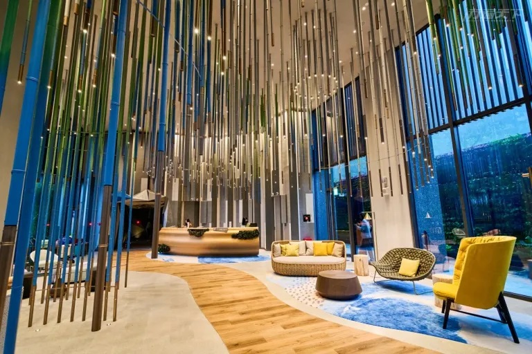 ▲ 大廳以穿梭竹林為意象,櫃檯則是象徵著阿里山精神的神木。(圖:行遍天下)