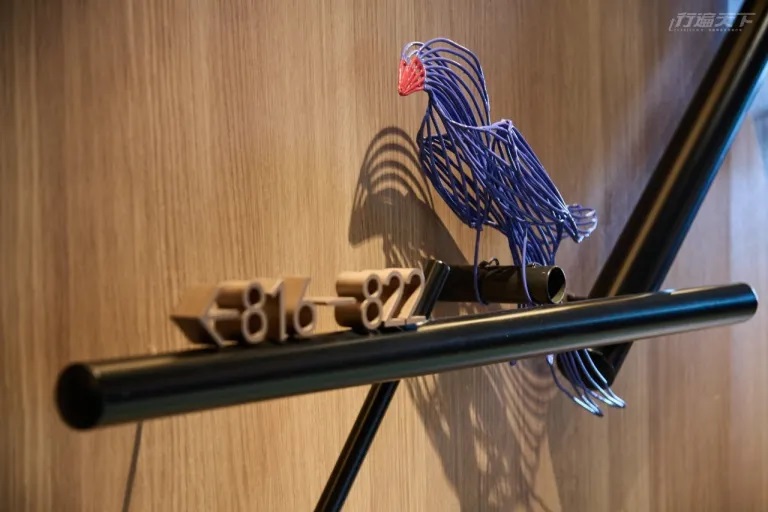 ▲ 電梯入口台灣藍雀守候著每位旅人到來。(圖:行遍天下)