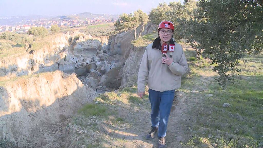 ▲ 台視採訪團隊前進哈塔伊省拍攝因地震裂成兩半的橄欖園。 (圖:台視)