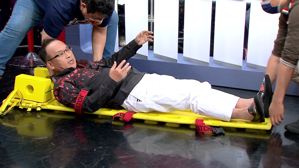 節目破天荒,讓來賓孔鏘躺在擔架上被抬進影棚,他說:「