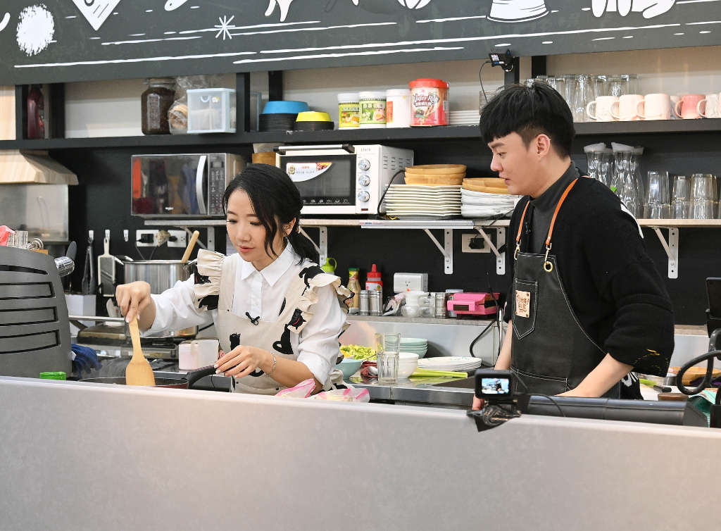 ▲ 執行長陶晶瑩(左)到廚房幫忙許富凱。 (圖:台視)