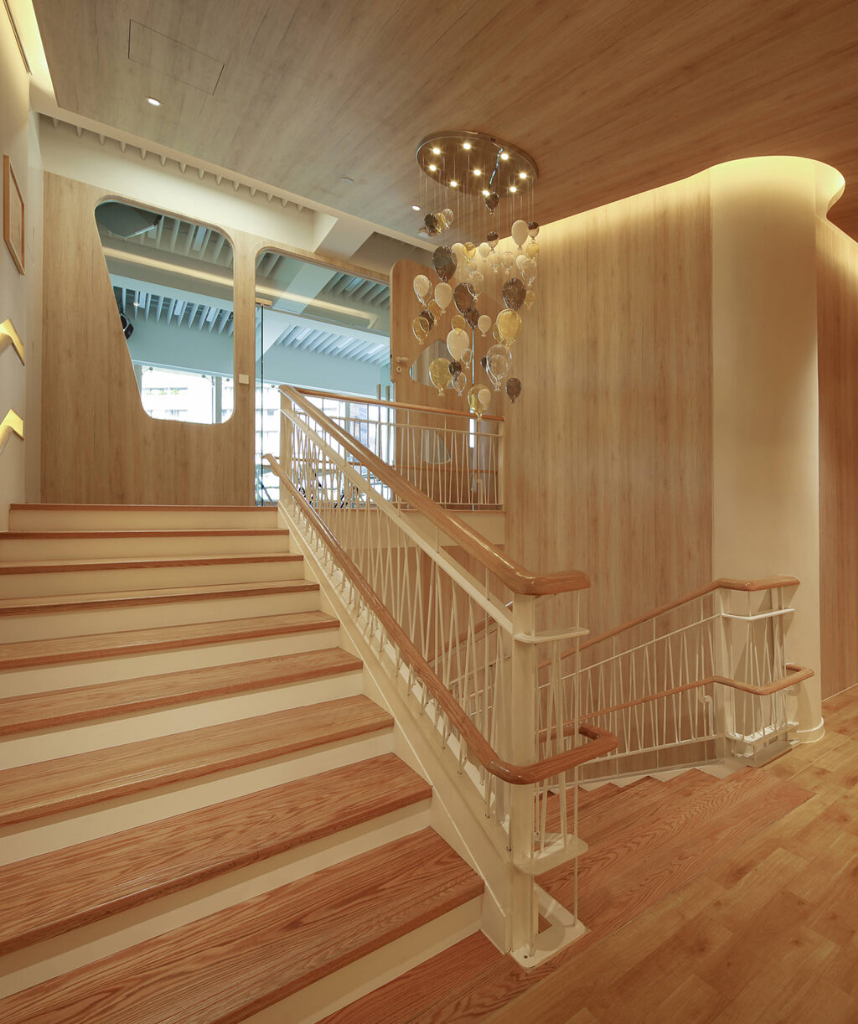 伴隨著如大樹枝幹的樑柱拾級而上,氣球造型的吊燈掛設於多功能教室入口處,描繪出宛如氣球向天空飛揚而去的景象,一如承載著孩子們對未來的想像,展翅飛翔。向內走去,採用木質地板搭配白色天花板,恰似從大樹延伸至天空那般逐漸明亮,彷彿訴說著孩童們從搖籃中被呵護,到逐漸成長學會獨立自主的過程。