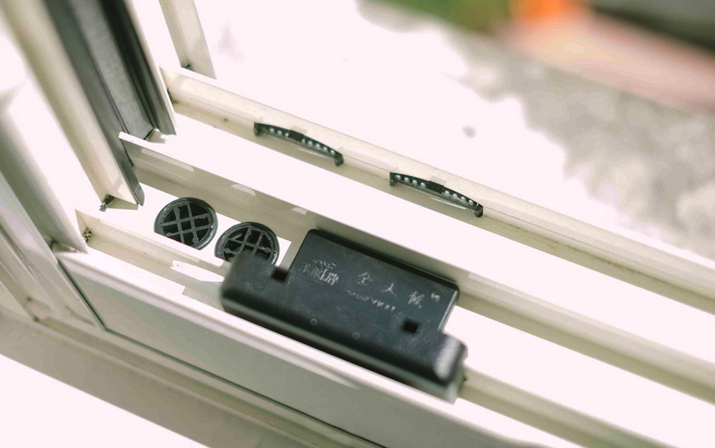 不同於市場高低階落差設計容易產生阻塞,本產品在外框下橫料軌道上預留適當排水孔,能導引窗扇所阻擋而落下的雨水順流而入,藉由排水通道迅速將雨水排出室外。排水閥片其一體成型、特殊弧線的快速排水通道,無懼水量的多寡都能迅速將雨水排出至室外,保護居家安全與裝潢完整,當風雨來襲不再整夜擰抹布塞毛巾,雨再大都不怕。利用風壓產生的推力,將閥門自動關閉,伏貼於橫料平面達到密閉效果,讓風、雨皆無法侵入,不易故障並可快速替換。