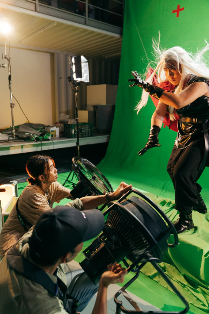 ▲ 陳庭妮蹲下用電風扇,讓大明星阿翰的假髮飛揚。(圖:威視電影)