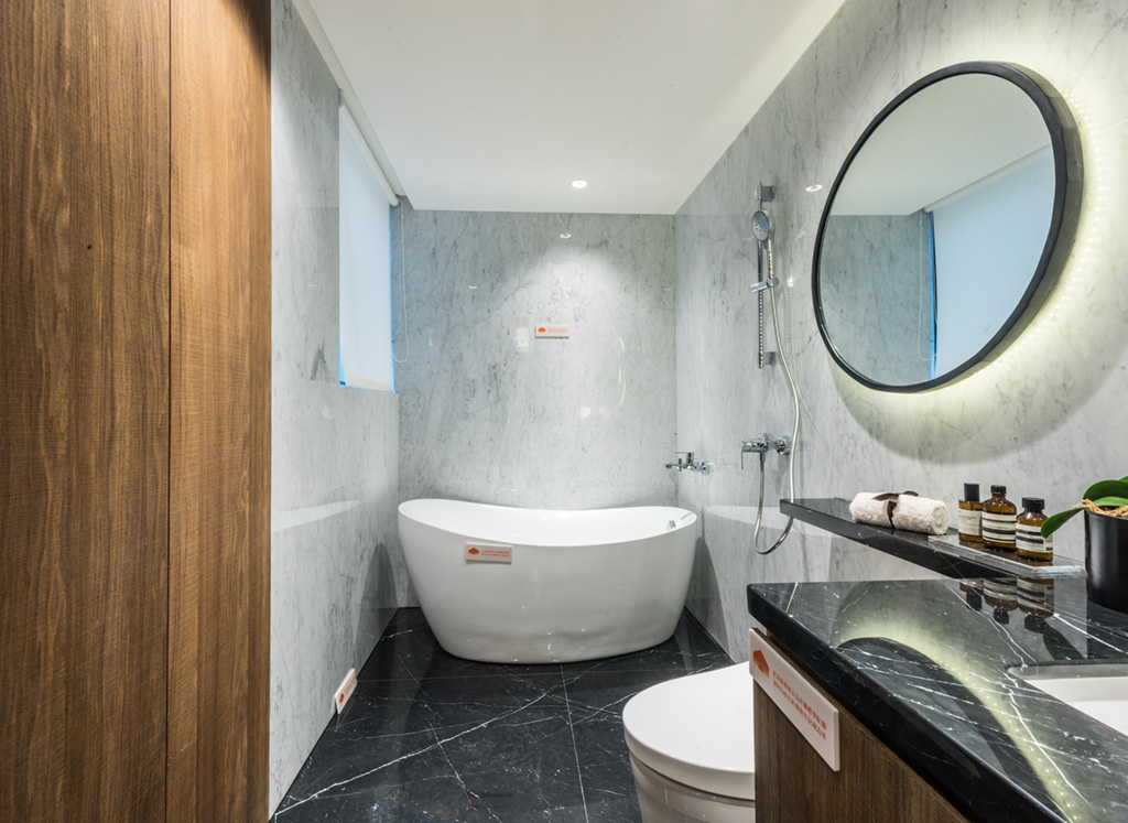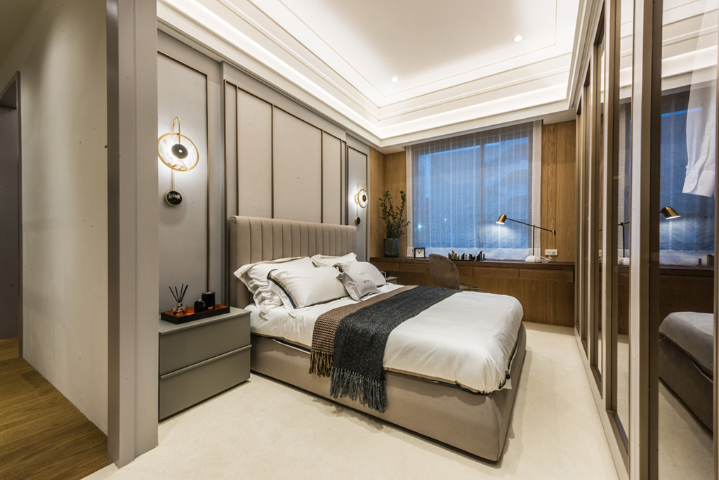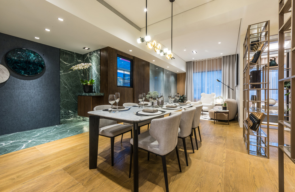 樣品屋展示了客廳、餐廳、浴室與臥室空間。客廳的大熊與小熊造型椅彼此相望,好似在聊著生活的趣事。餐廳、開放式廚房與品酩區豐富了用餐的層次,創造人們互動的機會。設計師利用金屬鐵件製成的收納架設置在品酩區四周,除了可以擺設酒、書籍與展示品外,也從餐廳中劃分了品酩區的空間。主臥室以寧靜的灰色與深棕色鋪陳,舒適的燈光照明與充足的衣櫃空間皆展現設計師對人們生活需求的精準拿捏。浴室白色大理石牆面讓衛浴空間增添一股清新氣質,黑色大理石具有避免地面顯髒的效果。設計師貼心地增加了曲線流暢優美的浴缸作為泡澡或孩童玩水之用。