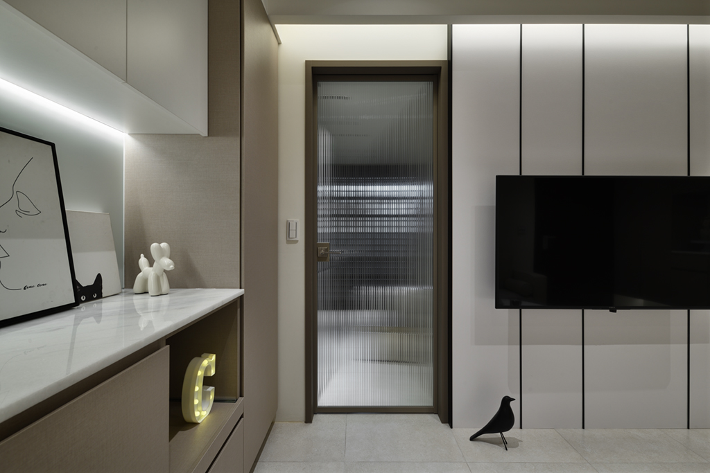 連接各機能區塊的門扉運用穿透感十足的玻璃,讓原先無窗的客廳暗房得已享受陽光,大大紓緩了空間壓迫感,也為公共區域增添朝氣。巧妙的設計不刻意強調空間區分,消彌場域界線,從將廚房備餐檯面延伸至客廳的規劃,到移動電視櫃至玄關,處處推動了各空間的交流感,在保有客廳寬敞的主旨上,最大限度降低生活可見的不便。