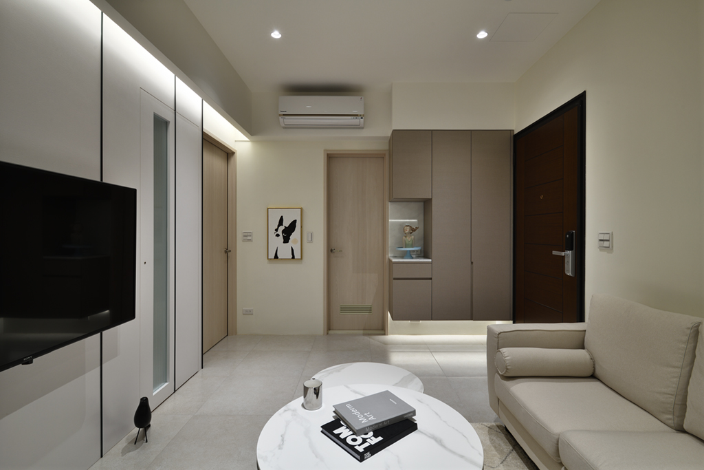 自玄關進入便可感受到空間所回饋的溫馨輕快,柔和的燈光打在潔白壁面上,打破了小坪數既有的擁擠刻板印象,取而代之的是暢通的視覺延伸。作為空間中樞的客廳空間,處處運用了隱藏式的巧思,將雜亂的線路埋藏在電視牆後,使來訪者進門便能感受完整大器的牆面,巧妙地引導視覺作瀏覽。