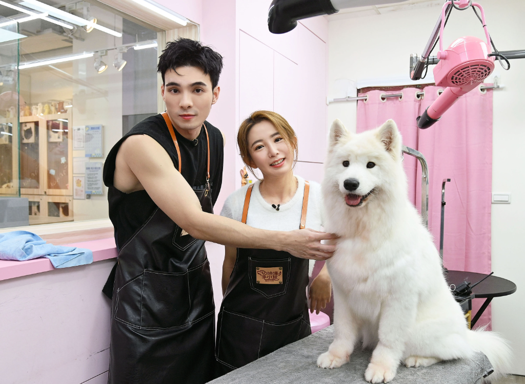 ▲ 黃偉晉(左)和郭書瑤完成薩摩耶的美容。(圖:台視)