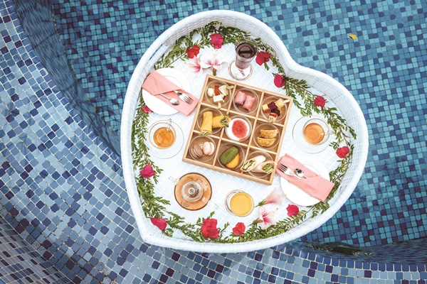 飯店更貼心設置粉靚交誼廳,在貴賓抵達時,即送上迎賓Happy Hours茶點,翌日還有下午茶時間,主廚親手實作分享靚點廚藝主題午茶(三選一),妳可以選擇客房內坐在陽台迎山面河的視野優雅品味,或是至里拉餐廳一覽運河河道之美佐美味午茶,更特別的是拋開束縛、舒服地在泳池中享用漂浮下午茶,這景象也太夢幻了吧!