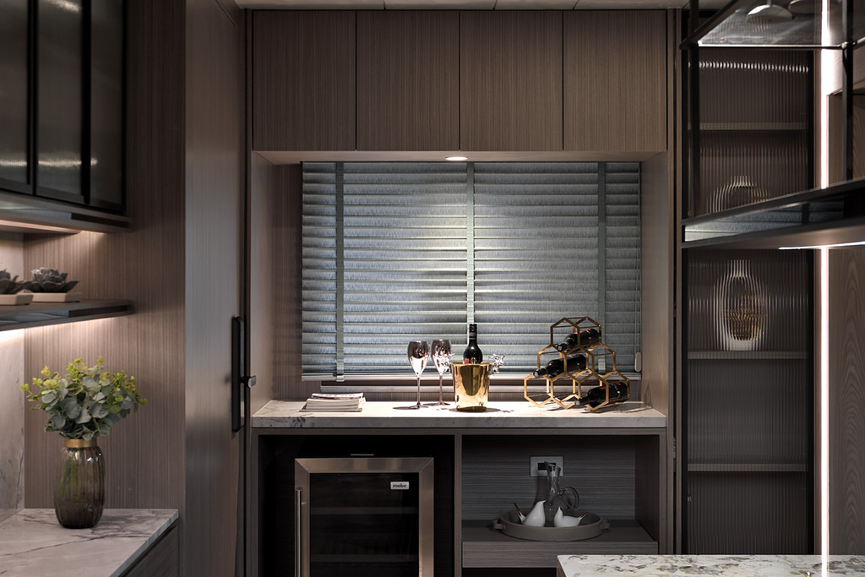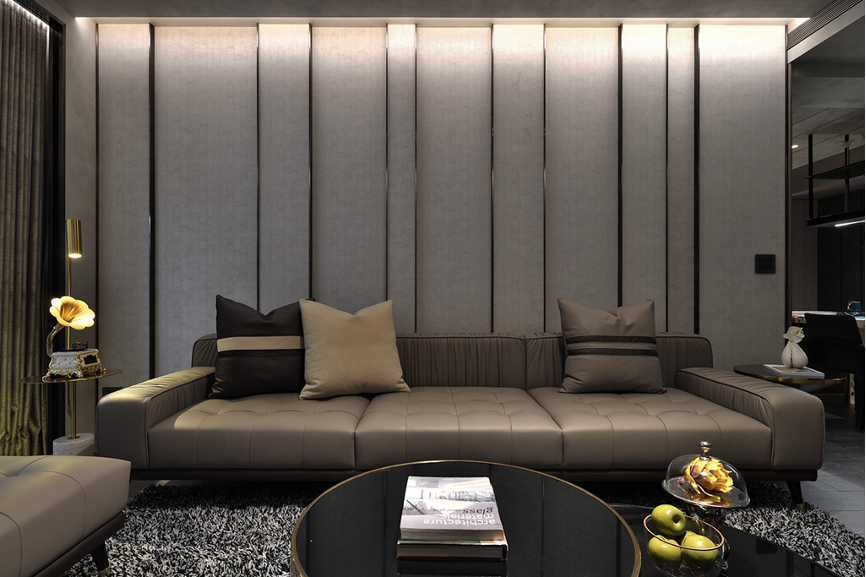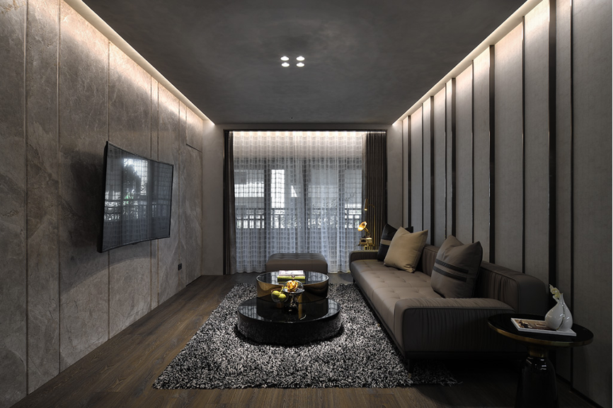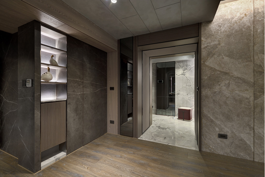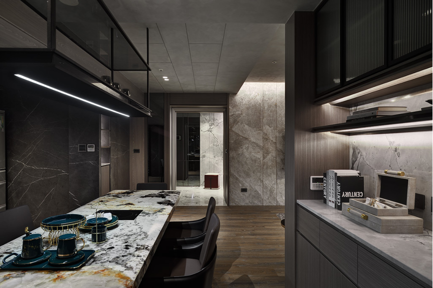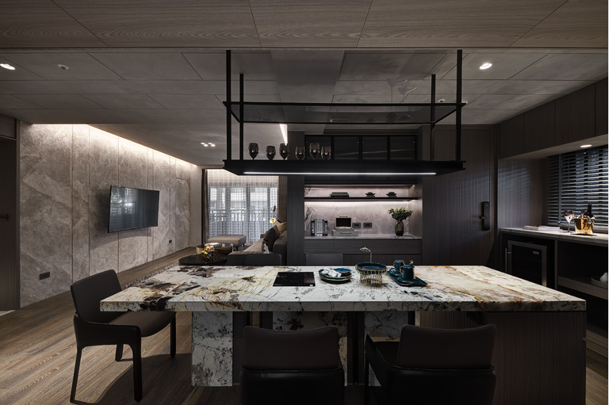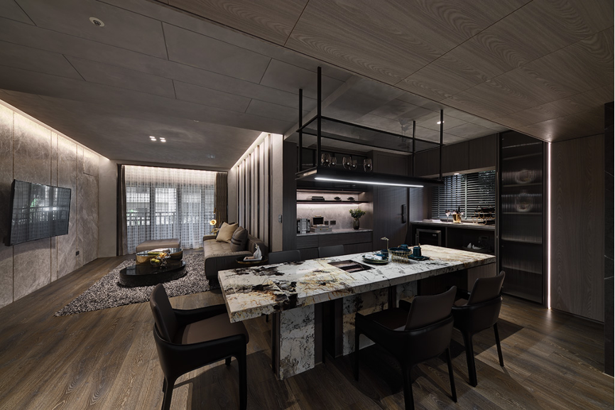 自玄關踏入,一目瞭然可見以木質與石料為主軸的氛圍,兩者相互搭營造低調奢華的美感。設計師透過流線型燈光讓建材質地有了呼吸感,每一顆粒與花紋隨光的流竄得到立體感;聚光燈則拉住視覺的焦點,讓目光感官凝聚在空間層層交疊起的平衡中,形塑出私密安全的空間包覆感。