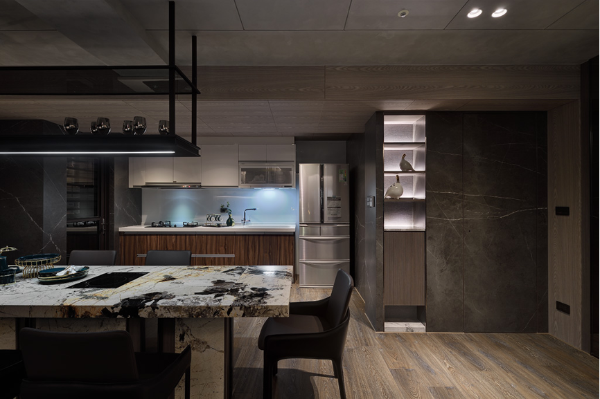 公領域以天花的高低落差及質地選擇作為區分,搭起視野直覺上的不同氛圍,巧妙造就相同質感、相異感受的流動形空間氛圍。拓影設計團隊選擇利用天然大理石的粗曠肌理,首先將自然感受帶進室內空間,後以再生性木料的柔和製成櫃體,兩者相互交融平衡了視覺。壁面精心設置的聚光燈則處處襯托了場域機能,讓人直覺化空間的機能性質,也凝聚出屋主的生活軌跡。