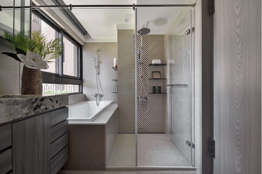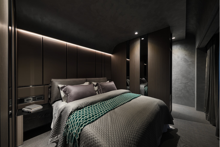 覓入私人空間的臥房,隱密感自空間中滿溢而出,與公領域的開放感相異,設計師使用較為深邃的質地築起人們生活中最隱密的一隅。明暗交融,衛浴場所採以白皙明亮為主體,搭配綠植營造環境淨化之感也助於人們卸下沈重的現實,回歸最單純的身心靈階段。