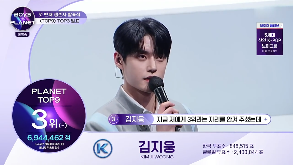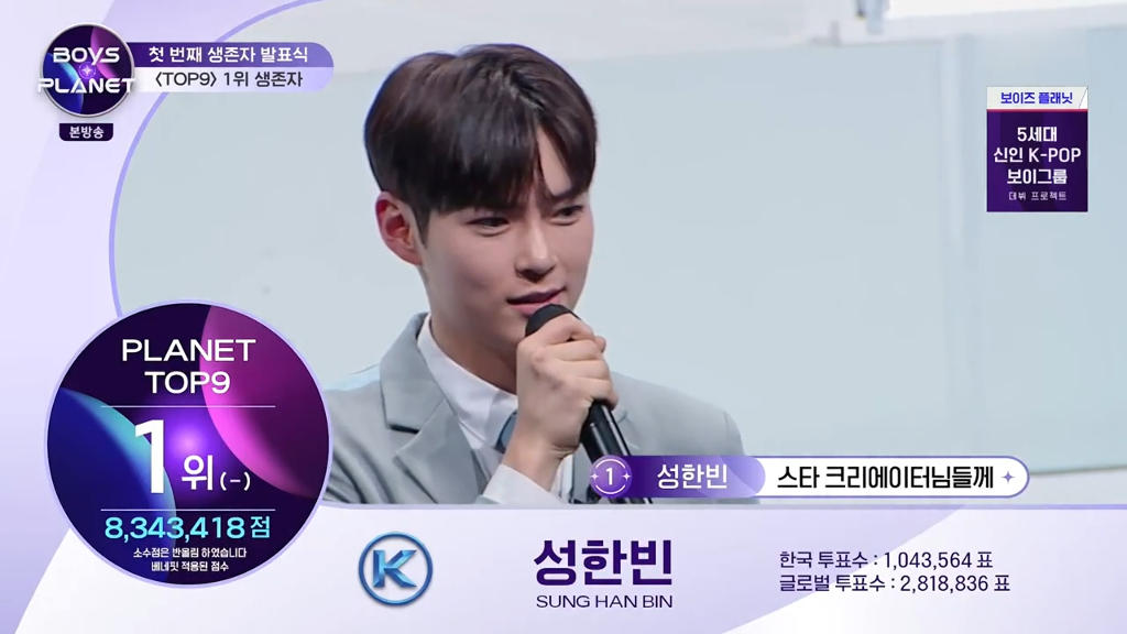 最受到觀眾們矚目的前9名出道位,成韓彬和SEOK MATTEW(石馬修)兩位一起度過練習生時期的好友再次相遇,共同爭奪第一名。最終由身為主題曲C位的成韓彬坐穩第一,他更是以將近140萬的票差斷層獲勝,他也激動地說:「首先,想說感謝能讓我再次站在夢中描繪的舞台的製作人們,因為我沒有認為第一名這個位置是絕對的,因此以後我也會非常努力,請大家多多期待,謝謝大家!」