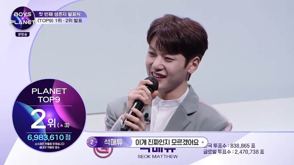 ▲ 第一次投票排名公布,第二名SEOK MATTEW(石馬修)。(截圖來源:Mnet)