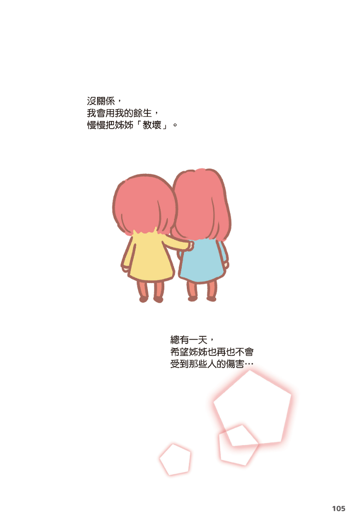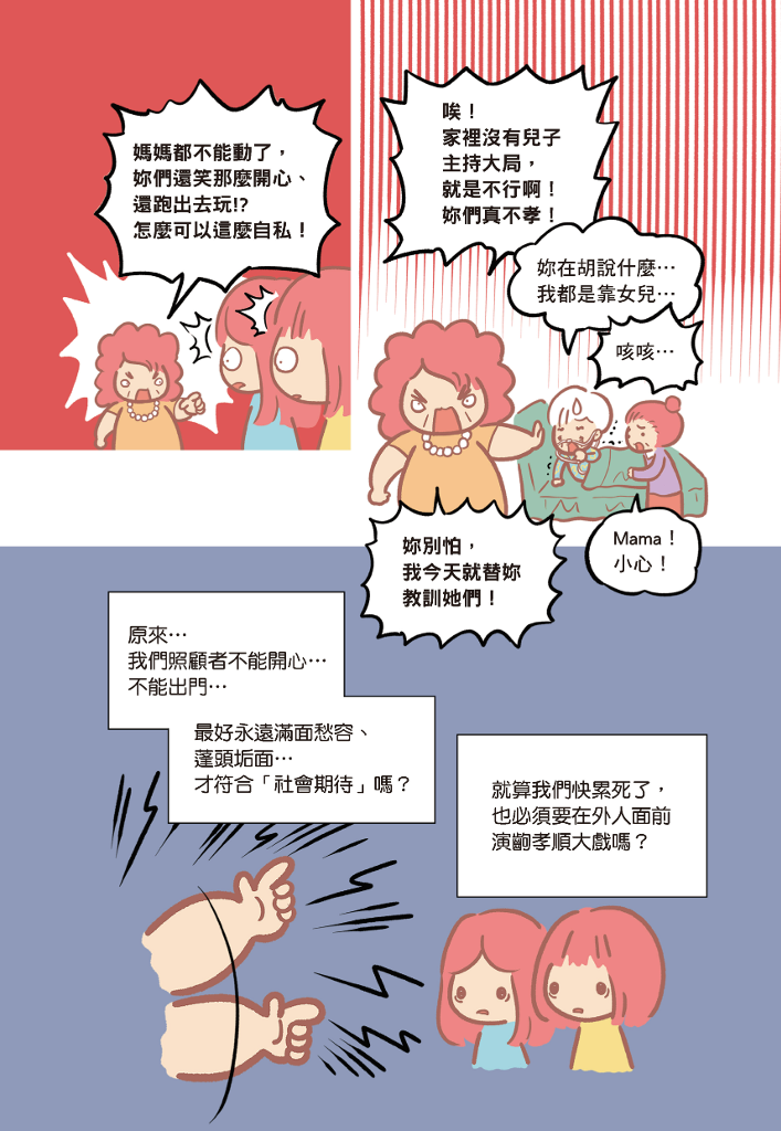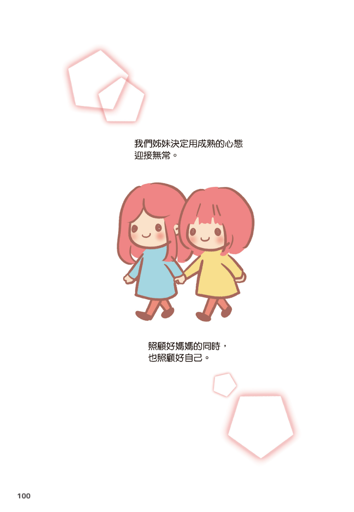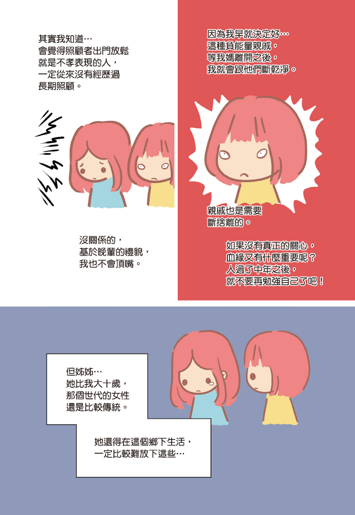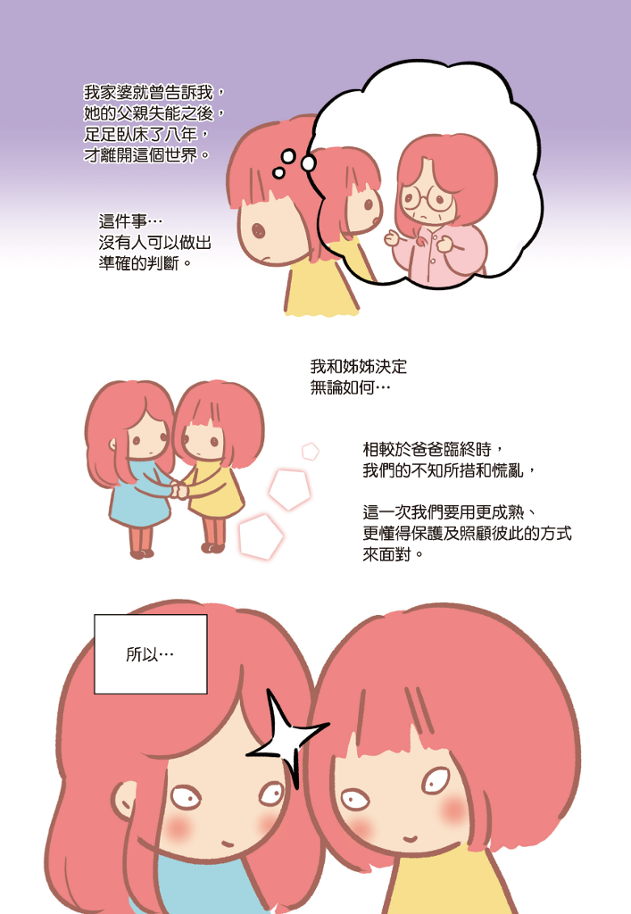 作者試著透過親身經驗,分享「照顧責任分攤問題」、「如何面對生死離別」、應該「在父母健康時預做準備」等議題,分擔照顧者的負擔,給予每位即將加入或正在經歷照顧旅程的人們一顆定心丸!
