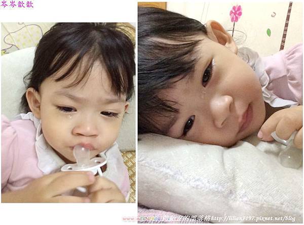 ▼可憐的歆歆,睡午覺時原本習慣吃奶嘴,可現在嘴巴側邊破個大洞,吃嘴嘴也會痛