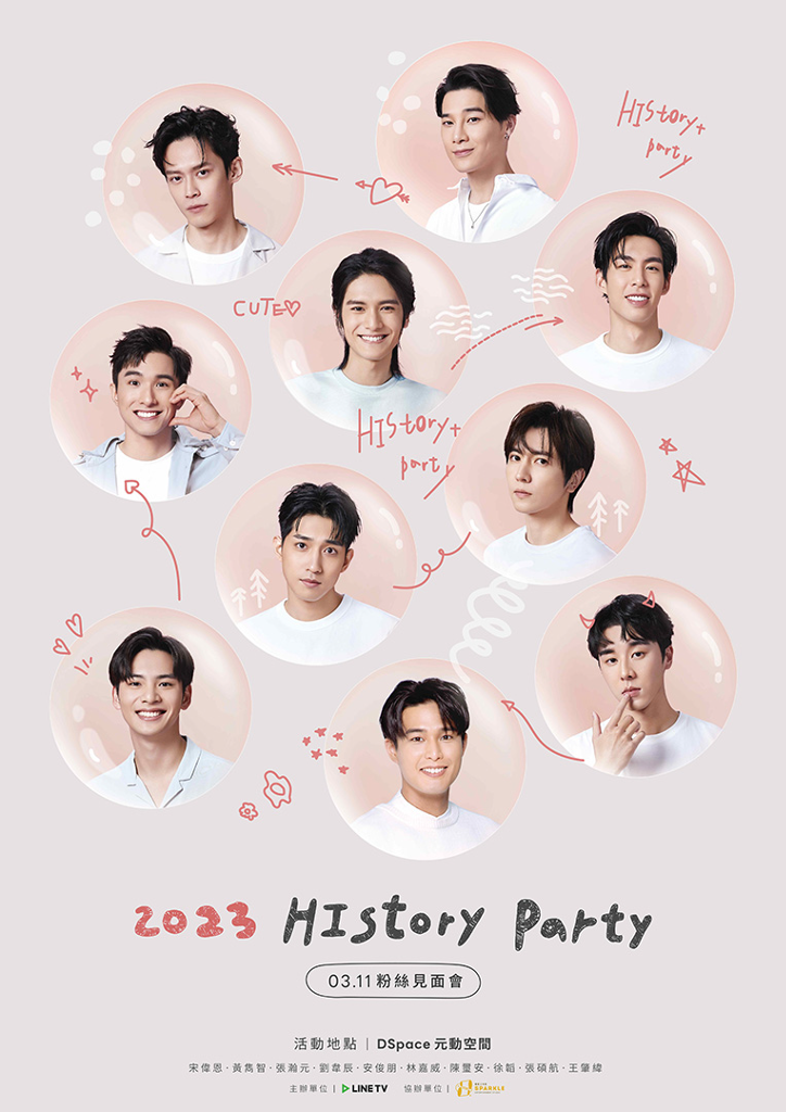 TV原創BL劇《HIStory》系列開創獨有的H宇宙,在台灣掀起BL劇風潮,為歡慶《HIStory》系列迎來6週年,特別邀請《HIStory3-那一天》宋偉恩、黃雋智,張瀚元、劉韋辰以及《HIStory4-近距離愛上你》安俊朋、林嘉威,《HIStory5-遇見未來的你》陳璽安、徐韜,張碩航、王肇緯等5組演員CP齊聚一堂,於3月11日(六)舉辦「2023