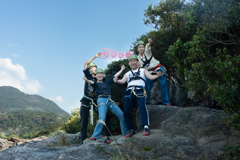 ▲ 吳念軒(左起)、謝瓊煖、屈中恆、大元挑戰攀岩。(圖:MyVideo)