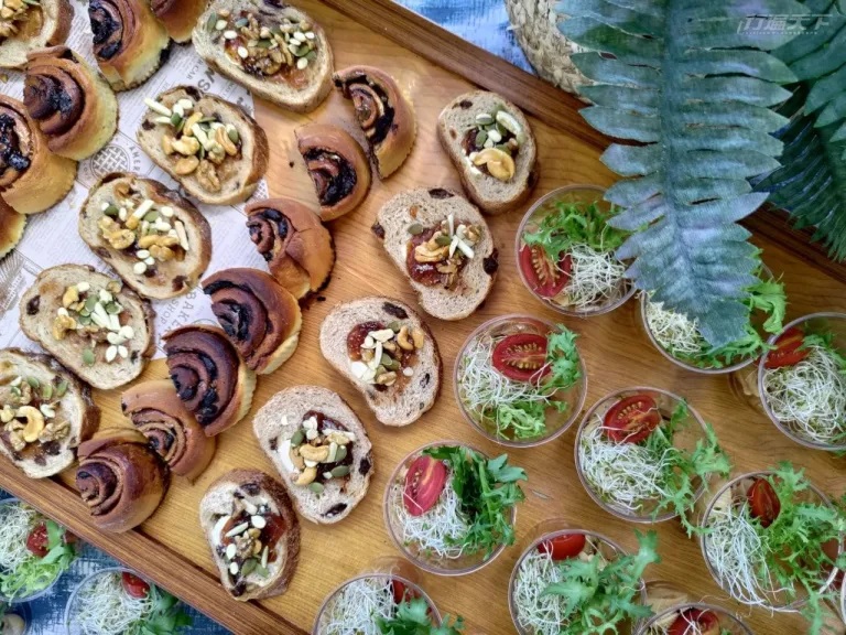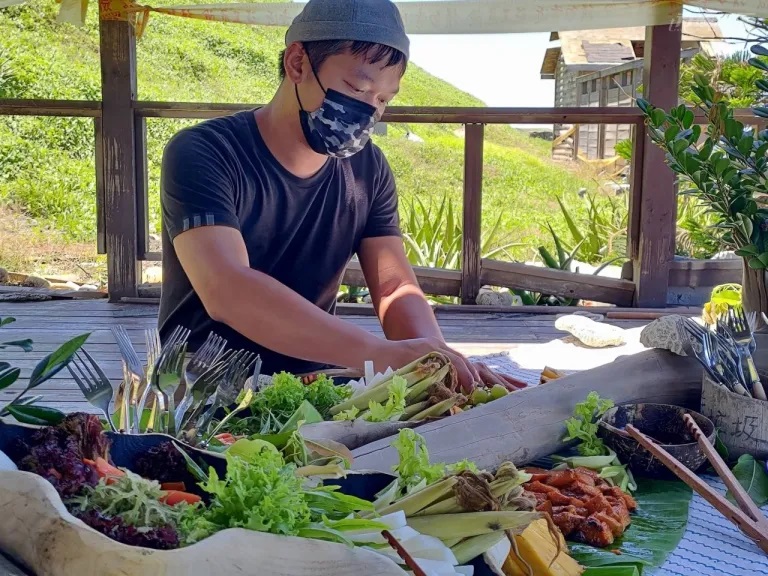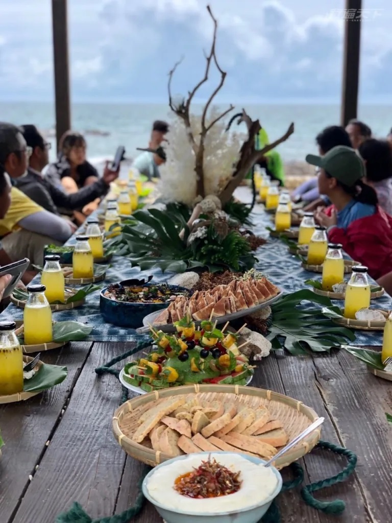即使無人島沒水沒電,也難不倒移居澎湖十多年開餐廳的他們,帶著澎湃的澎湖海鮮與農特產上島:海菜、紫菜、丁香魚、珠螺等,和當季時蔬、當地大餅和手工麵包等,在地食材與現場素材信手捻來,浪花餐桌團隊如魔術般變出一場海濱最美的餐桌。