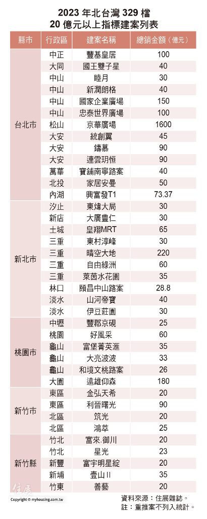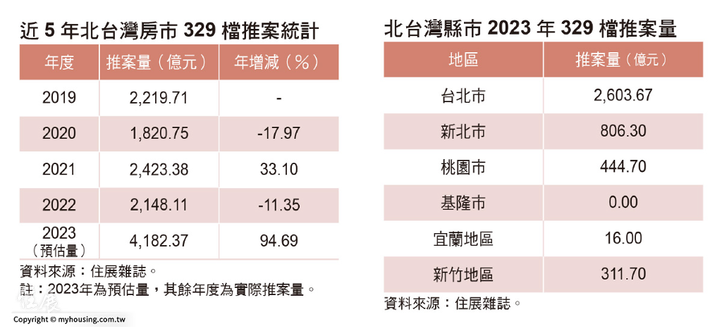 根據住展雜誌統計,今年北台灣房市329檔推案預估量4,182.37億元,較去年同期成長約2,034.26億元、年增超過九成四,再創歷史新高紀錄。其中,住宅推案量約2,229億元,較去年住宅推案量成長約131.57億元、6.27%。其餘案量則來自商、廠辦案,指標案包括「京華廣場」、「國家企業廣場」、「忠泰世界廣場」、「東煒大局」等。