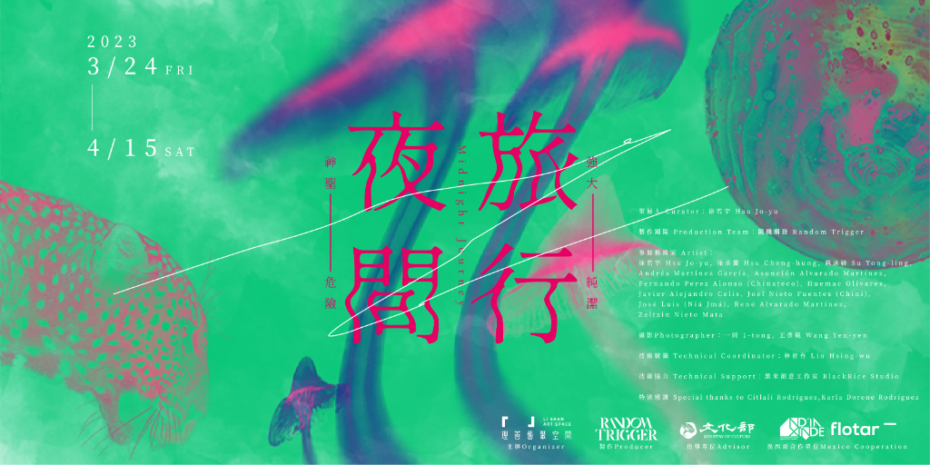 本次展覽《夜間旅行─神聖、危險、強大、純潔》為「RANDOM TRIGGER 隨機觸發」前往墨西哥瓦哈卡州馬薩克特山脈創作研究薩滿文化,為期半年,該計畫獲選2022年文化部計畫支持。