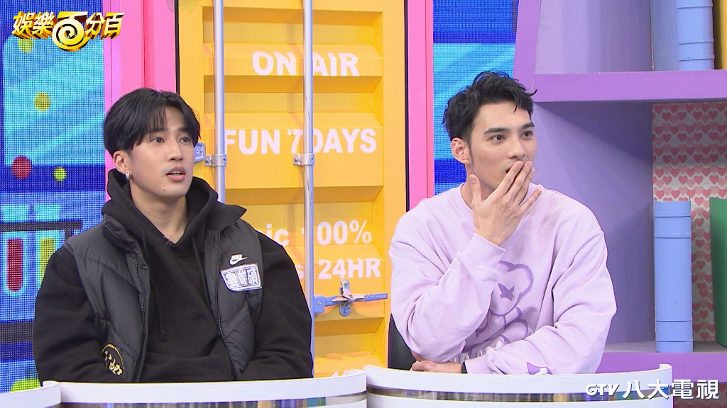 ▲ 《娛樂百分百》錄製桌遊研究社,黃偉晉(右)大力推薦給觀眾,婁峻碩(左)在遊戲結束後意猶未盡。(圖:八大)