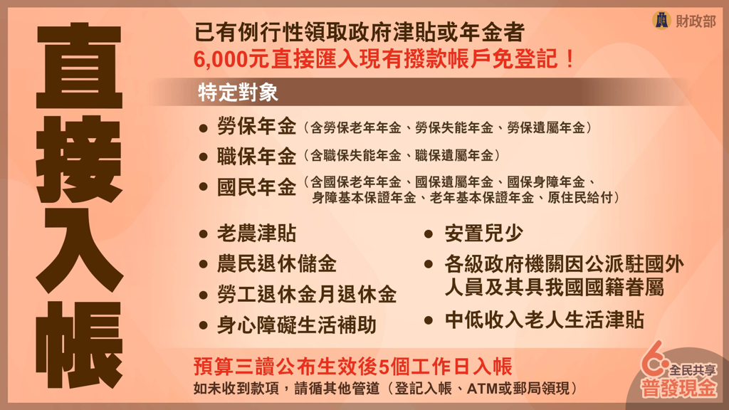 1.「直接入帳」:約4百萬人可直接入帳,對象包括領有勞保年金、職保年金、國民年金、老農津貼、農民退休儲金、勞工退休金月退休金、安置兒少、身心障礙生活補助、中低收入老人津貼、各級政府機關因公派駐國外人員及其具我國國籍眷屬等特定族群,不須登記,直接匯入帳戶。預算三讀公布生效後5個工作日入帳。