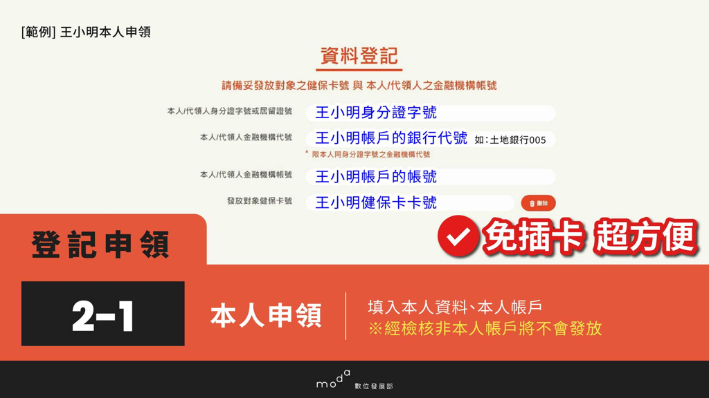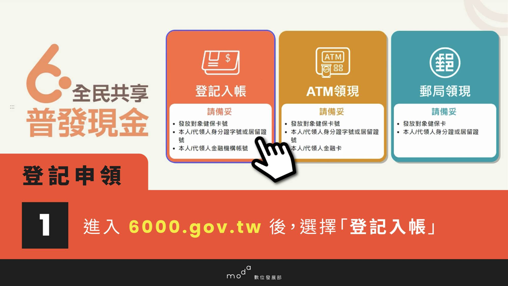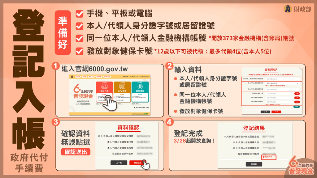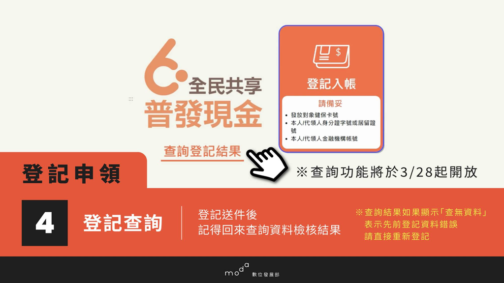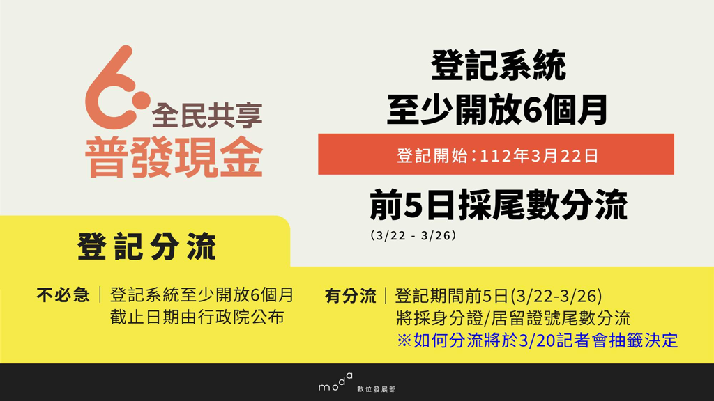 3.「登記入帳」:今年3月22日先開放「登記入帳」預登記,備妥手機、平板、電腦、健保卡、身分證、金融機構帳號,可至6000.gov.tw官網登記入帳。3月22日至3月26日之間,採身分證字號或居留證號尾數分流,每日開放兩組尾數的民眾登記,順序如下: