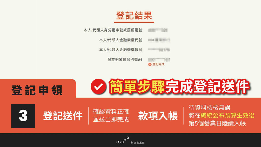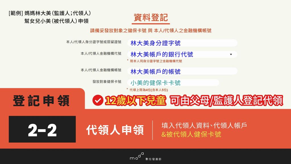3月28日起開放修改以及查詢登記資料是否正確、符合領取資格等資訊。預計總統公布預算生效後第5個營業日陸續入帳。特別須留意的是12歲以下兒童可由父母代為上網登記,詳細步驟如下圖:
