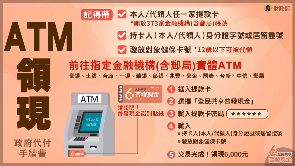 4.「ATM領現」:須備妥健保卡、身分證、提款卡赴13家指定金融機構(包括台灣銀行、土地銀行、華南銀行、兆豐銀行、第一銀行、彰化銀行、合作金庫、台灣中小企業銀行、國泰世華銀、中信銀、中華郵政、台新銀、玉山)設置的約2萬6000台ATM機台領取現金。請認明普發現金識別貼紙。ATM領現啟動時間,暫定為總統公布預算案生效後「加14天」。操作步驟如下圖: