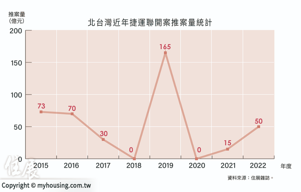 根據住展雜誌統計,北台灣近8年有8個捷運聯開案進場銷售(重推案不計),期間以2019年間新案較多,當年推案量一口氣攀升至165億元,其次為2015年,全年推案量73億元。