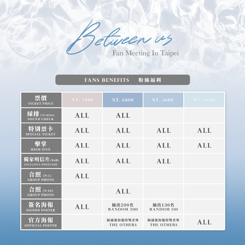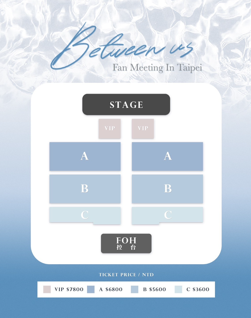 「Between us Fan Meeting in Taipei 2023」門票將於 4 月 9 日(日)中午 12 點於 KKTIX、全家 FamiPort 正式開賣,票價為 VIP NT$7,800 / A區 $6,800 / B區 $5,600 / C區 $3,600 (全區對號入座),相關詳情可密切注意主辦單位「Boo’s Entertainment」官方 IG 與官方 Twitter。